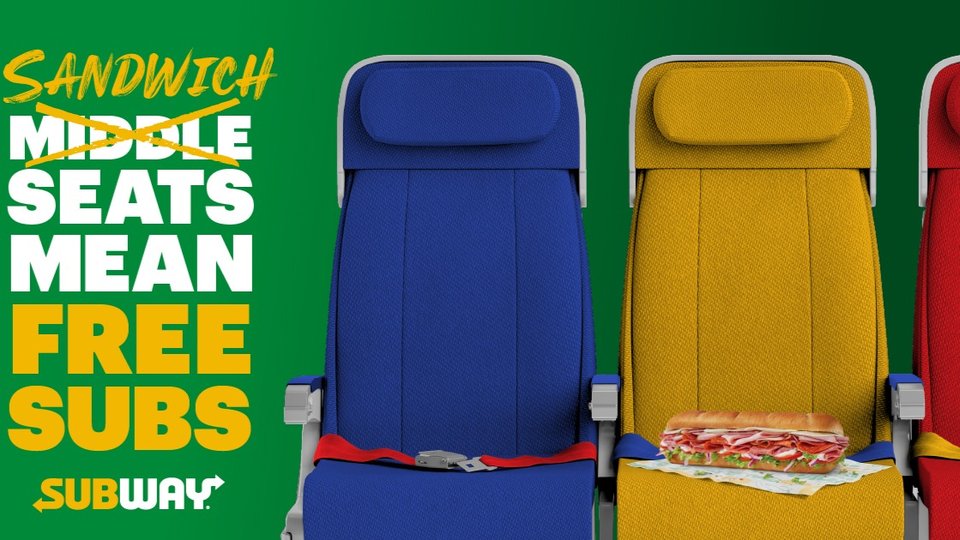 "Getting sandwiched in a middle seat no matter how early you check in is not something many travelers will love. So, on Tuesday, we're going to turn a bad 'sandwich' into a great sandwich by reassigning 737 middle-seaters a $20 Subway gift card. It's as easy as A-B-C, and the bag is free," Dave Skena, CMO, Subway North America, said in a press release.